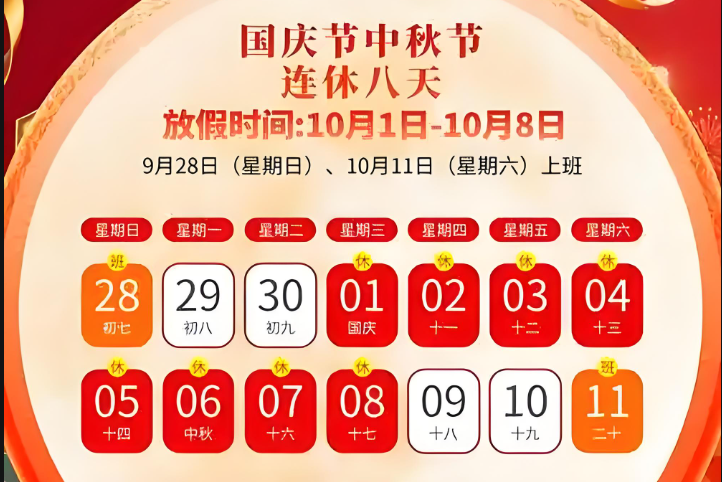 國(guó)慶節(jié)放假安排:10月1日(周三)至8日(周三)放假調(diào)休,共8天。9月28日(周日)、10月11日(周六)上班。